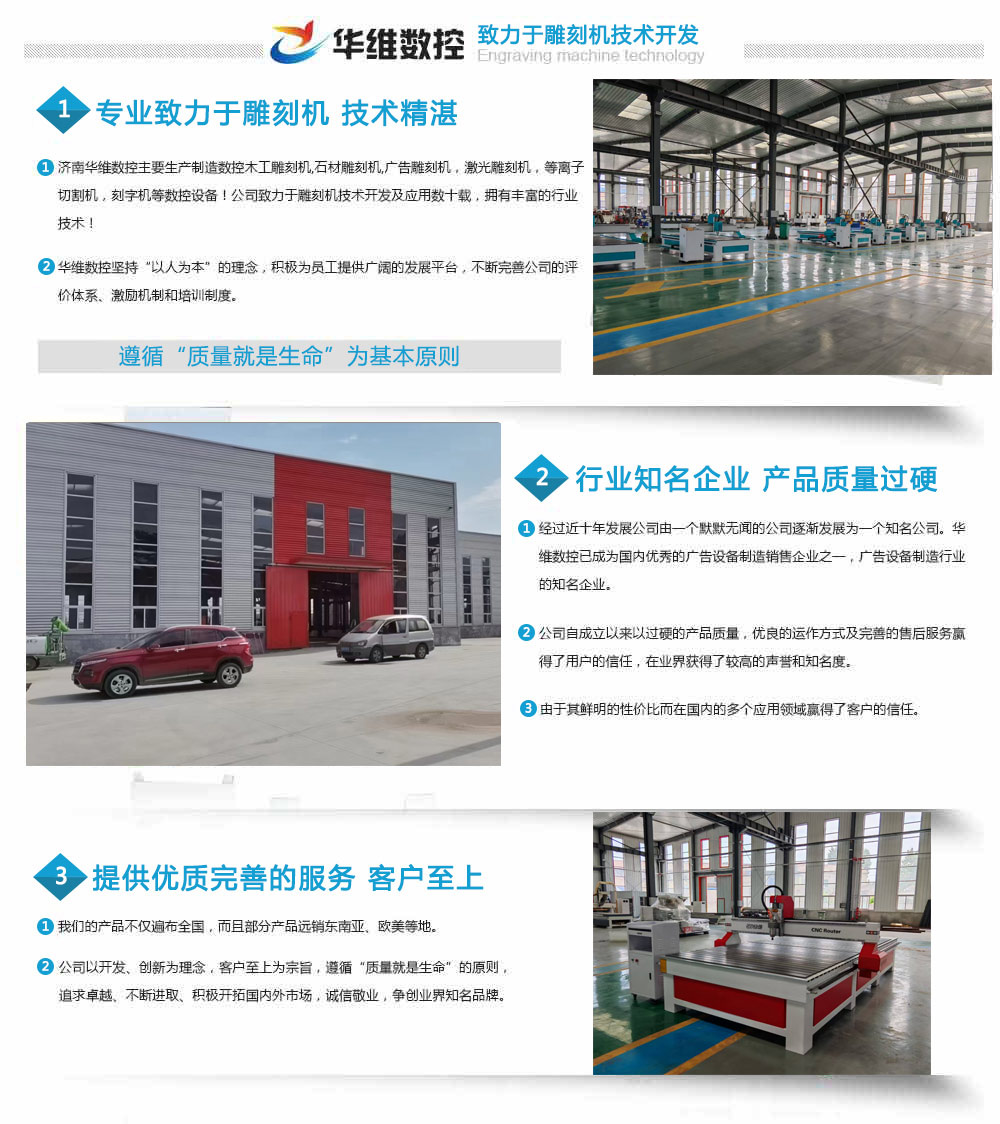濟(jì)南華維數(shù)控主要生產(chǎn)制造數(shù)控木工雕刻機(jī),石材雕刻機(jī),廣告雕刻機(jī),激光雕刻機(jī),等離子切割機(jī),刻字機(jī)等數(shù)控設(shè)備!公司致力于雕刻機(jī)技術(shù)開(kāi)發(fā)及應(yīng)用數(shù)十載,擁有豐富的行業(yè)技術(shù)! 華維數(shù)控堅(jiān)持“以人為本”的理念,積極為員工提供廣闊的發(fā)展平臺(tái),不斷完善公司的評(píng)價(jià)體系、激勵(lì)機(jī)制和培訓(xùn)制度。經(jīng)過(guò)近十年發(fā)展公司由一個(gè)默默無(wú)聞的公司發(fā)展為一個(gè)知名公司。華維數(shù)控已逐漸成為國(guó)內(nèi)優(yōu)秀的廣告設(shè)備制造銷(xiāo)售企業(yè)之一,廣告設(shè)備制造行業(yè)的優(yōu)秀企業(yè)。公司自成立以來(lái)以過(guò)硬的產(chǎn)品質(zhì)量,優(yōu)良的運(yùn)作方式及完善的售后服務(wù)贏(yíng)得了用戶(hù)的信任,在業(yè)界獲得了較高的聲譽(yù)和知名度...