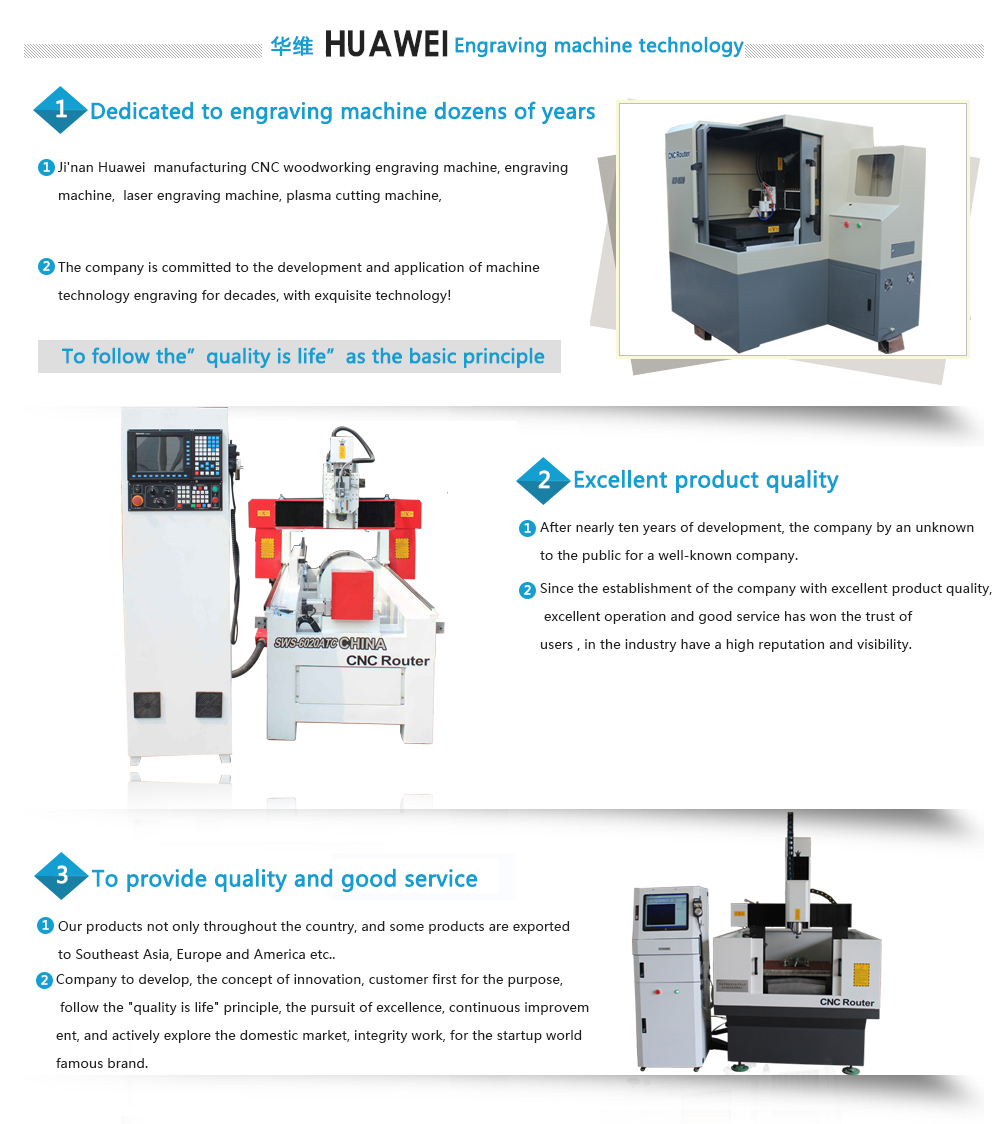 Ji'nan Huawei CNC manufacturing CNC woodworking engraving machine, engraving machine, engraving machine, laser engraving machine, plasma cutting machine, engraving machine, CNC equipment! The company is committed to the development and application of machine technology engraving for decades, with exquisite technology!Huawei CNC adhere to the "people-oriented" concept, and actively provide broad development platform for the employees, and constantly improve the company's evaluation system, incentive mechanism and training system. After nearly ten years of development, the company by an unknown to the public....