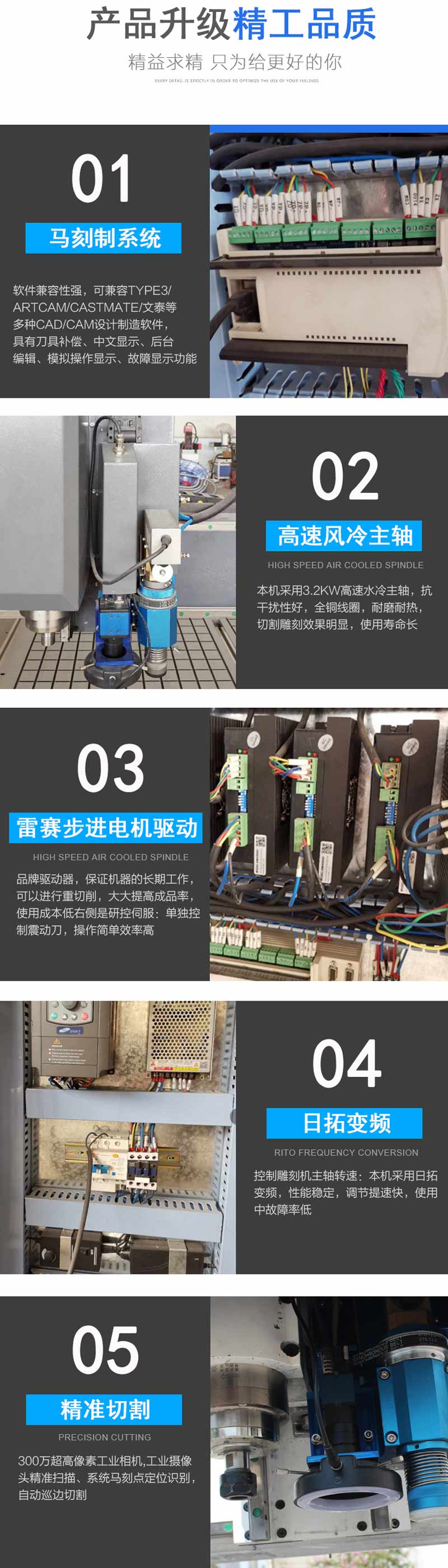 ◆ 采用意大利進口風冷換刀主軸,精度高,壽命長,運行平穩(wěn),長時間加工穩(wěn)定可靠。