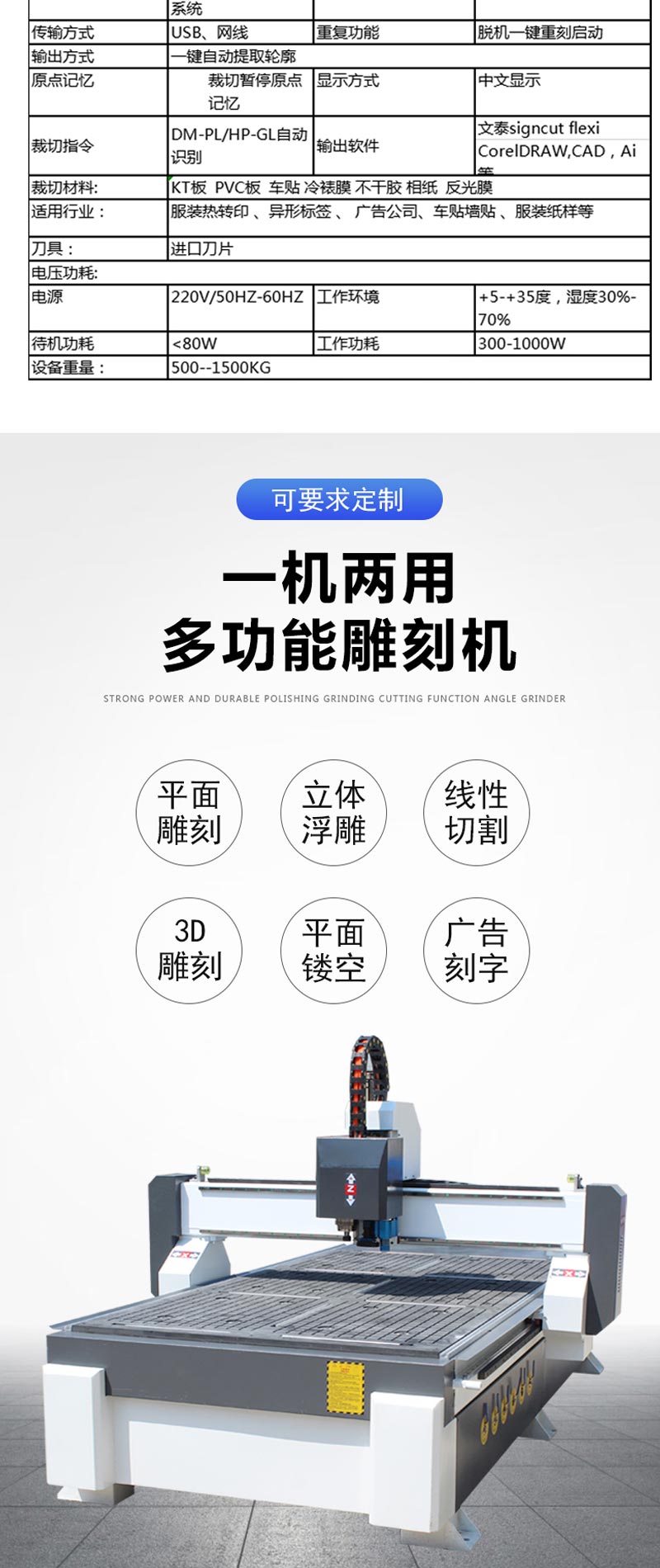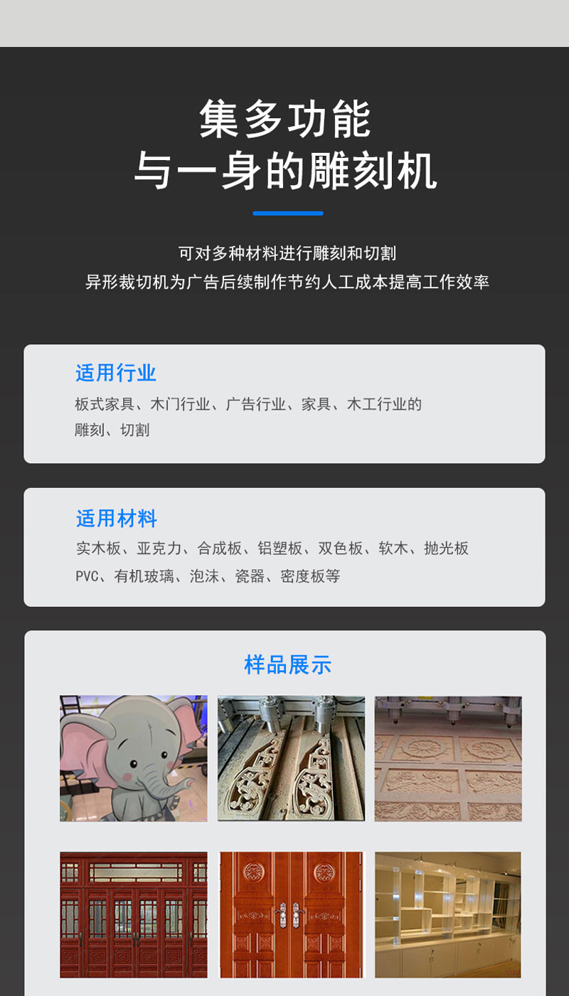 主要用于別墅門雕刻,適用于生產櫥柜門、實木門、電腦桌、板式家俱等。可用于大面積、大產量的密度板、實木板的平面雕刻、切割、3D浮雕等工藝制作。